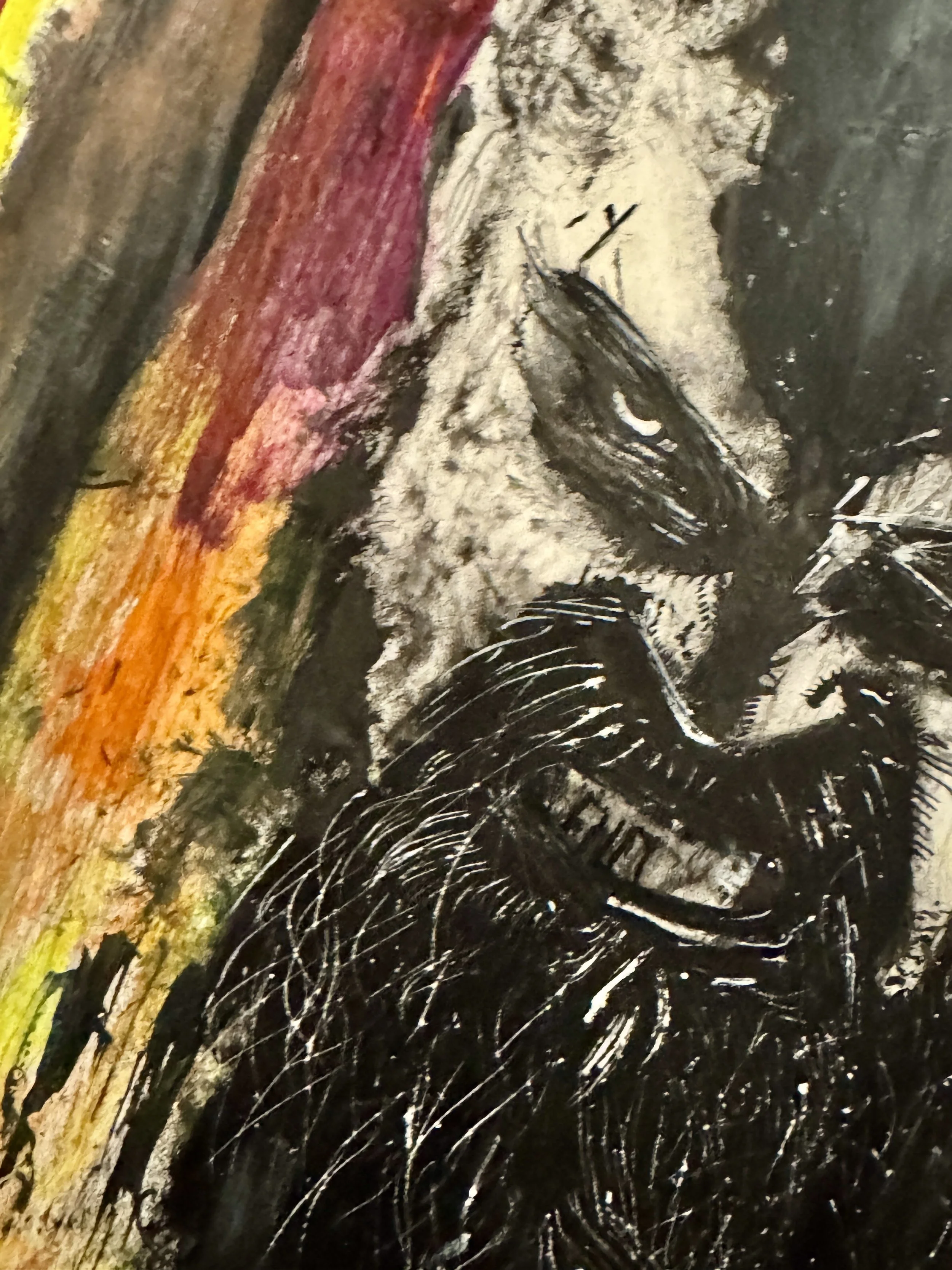 This is not a fantasy creature, but a portrait of the familiar: the part of us that smolders, snarls, and sometimes surfaces. The ink scratches and pencil burns evoke the feeling of a confession carved into skin.