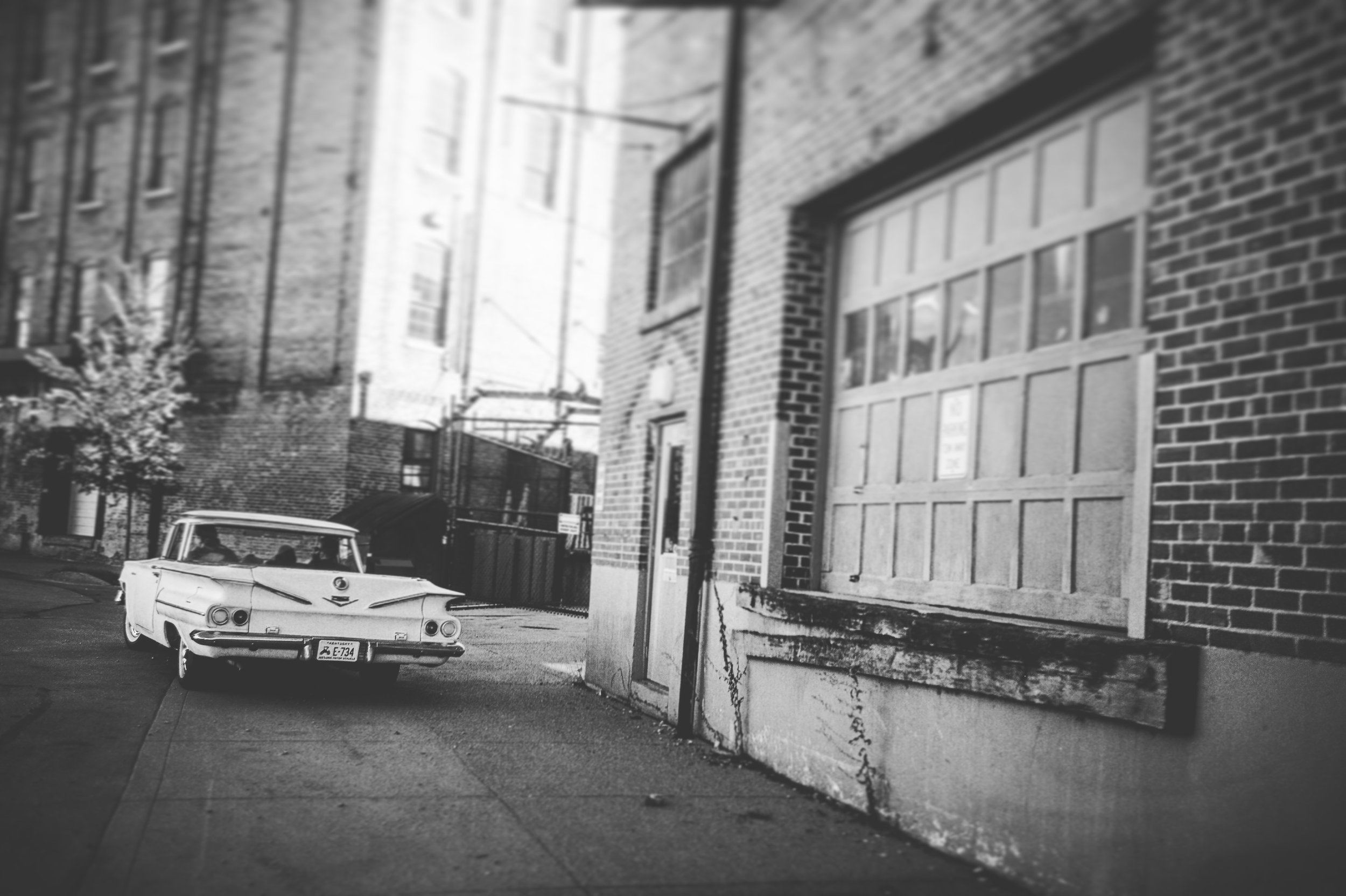 A vintage car turns slowly through an alley framed by brick and shadow. Architecture closes in around it. The distortion from the damaged sensor gives the scene a slightly unsteady perspective, like a memory bending at its edges. Nostalgia here is not sentimental. It is weathered.