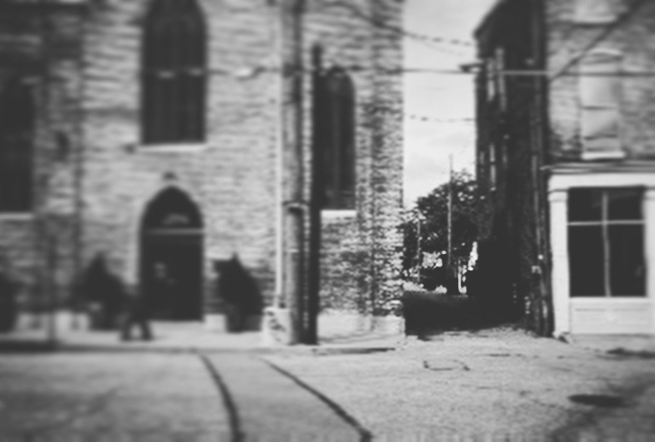 A church façade stands in partial blur, its stonework softened into texture rather than detail. The building appears both solid and dissolving. The camera’s instability removes certainty from the structure. Belief becomes atmosphere.