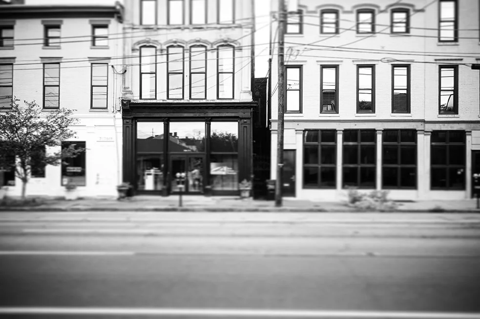 Historic storefronts line a quiet street, windows reflecting nothing in particular. The perspective feels slightly detached, as though observed from a moving vehicle. The broken sensor mutes clarity, turning commerce into memory. The street holds its breath.