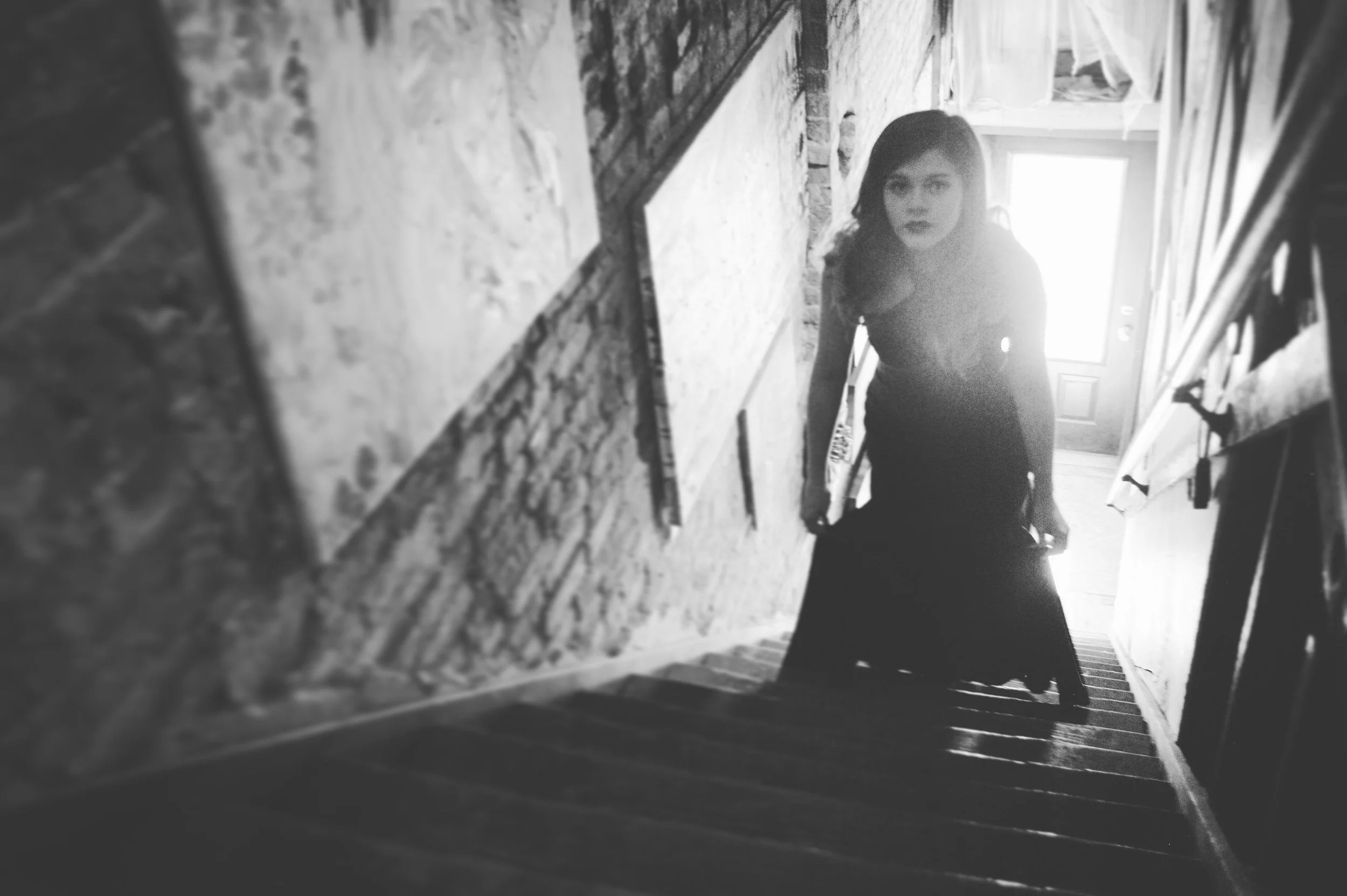 A woman climbs a narrow staircase toward a washed out doorway. Light overtakes detail at the threshold. The camera’s imperfection heightens the tension between shadow and illumination. Movement here feels deliberate, almost ritual.