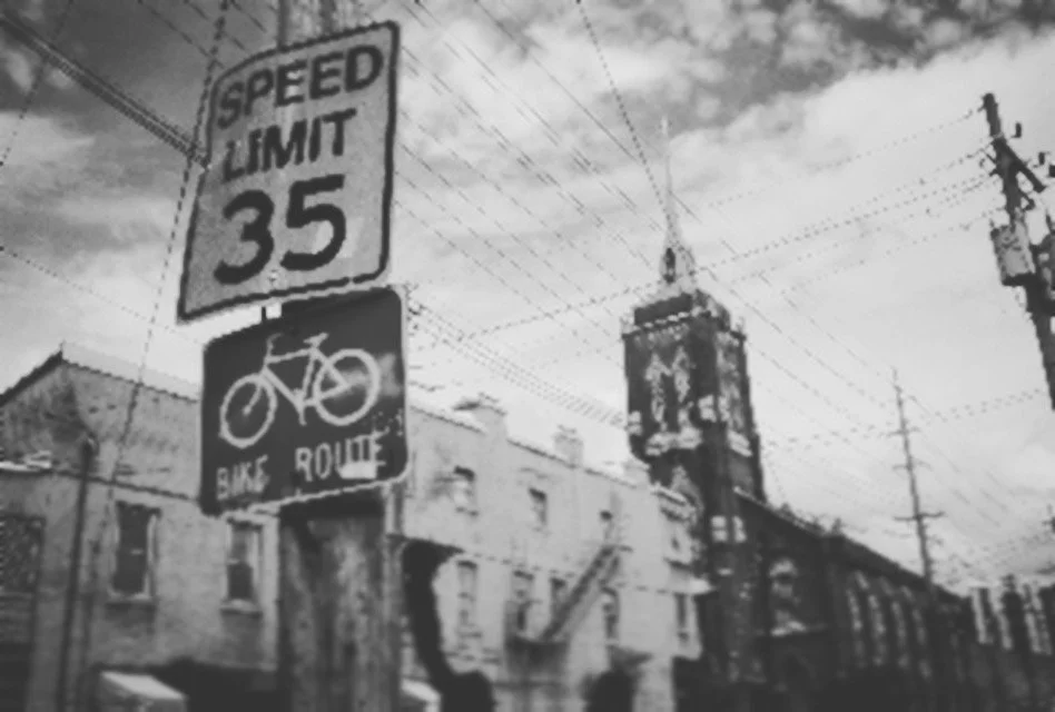 A speed limit sign interrupts a sky crowded with power lines. The directive feels arbitrary in a place so still. The softness and tonal drift flatten urgency into contemplation. Regulation becomes abstraction.