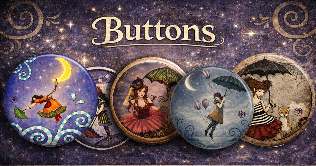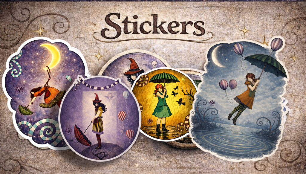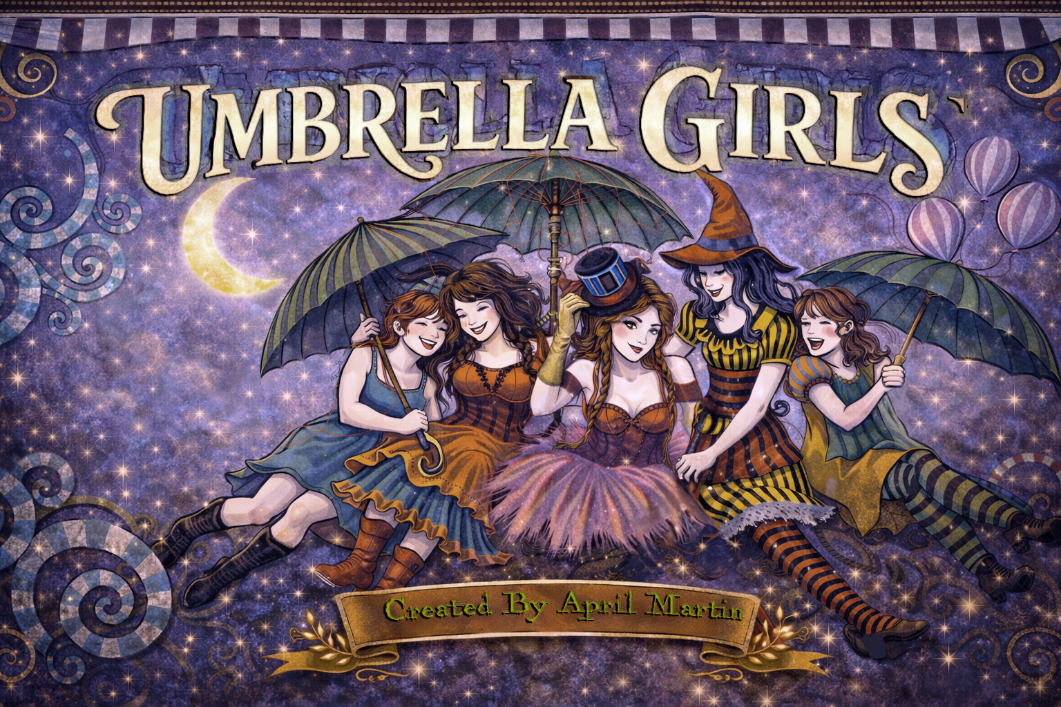She stands in the rain, umbrella lowered, as if she has already walked through the storm and decided to stay anyway. Striped stockings, a tilted hat, and drifting carnival balloons hint at a world both playful and haunted. Behind her, a faded emblem lingers like a memory. Below her feet, a winged heart bleeds into the earth.
